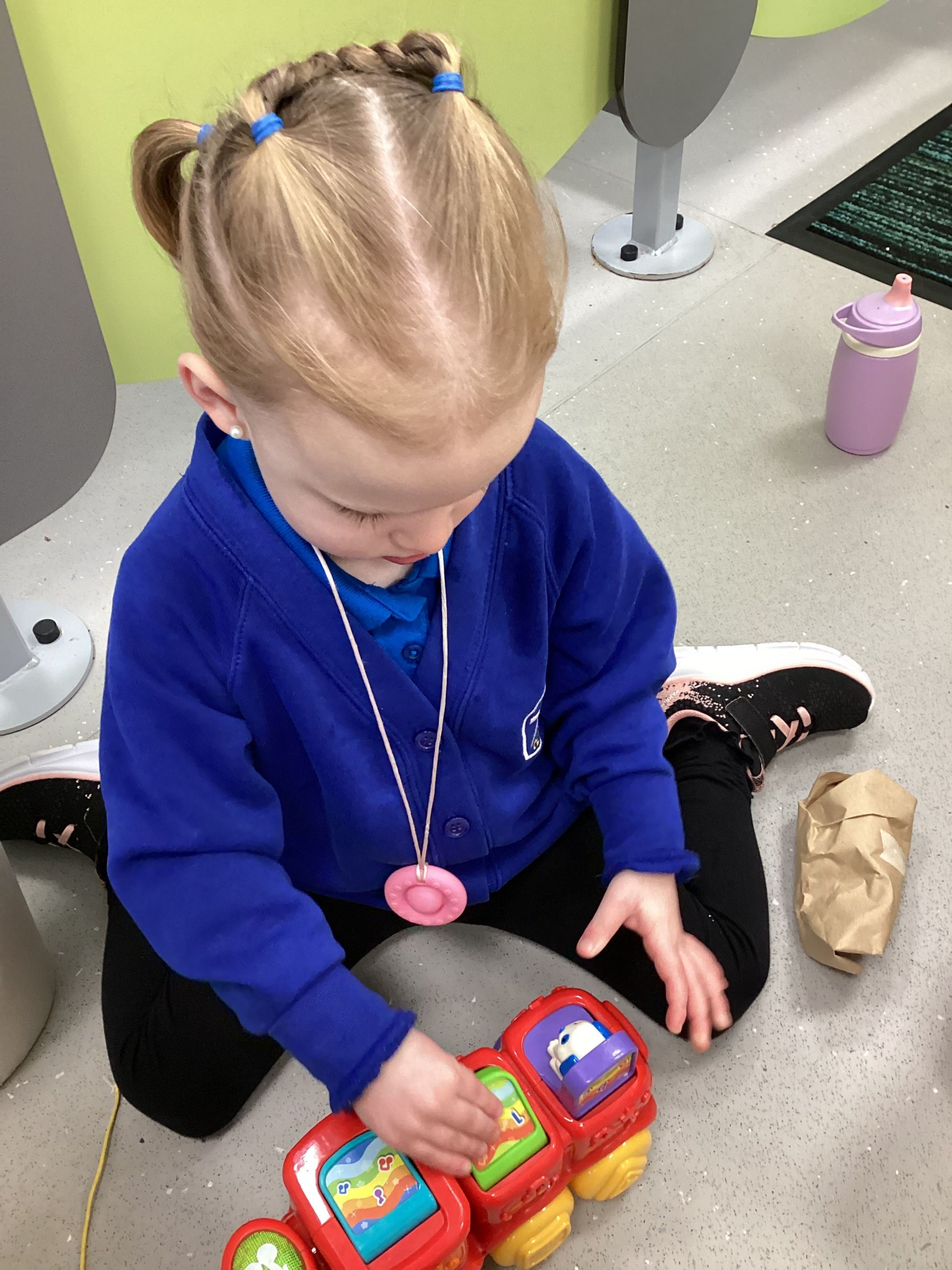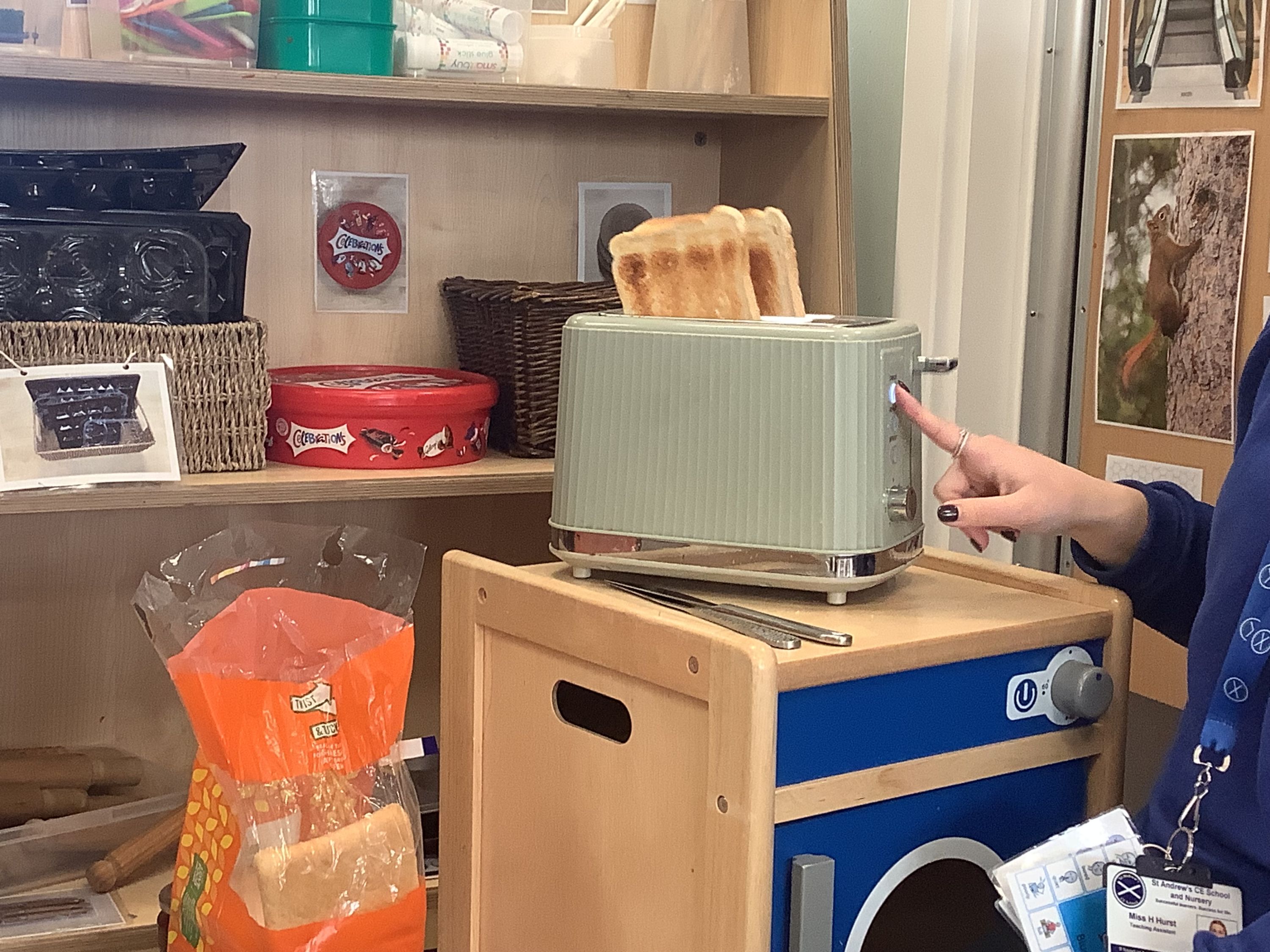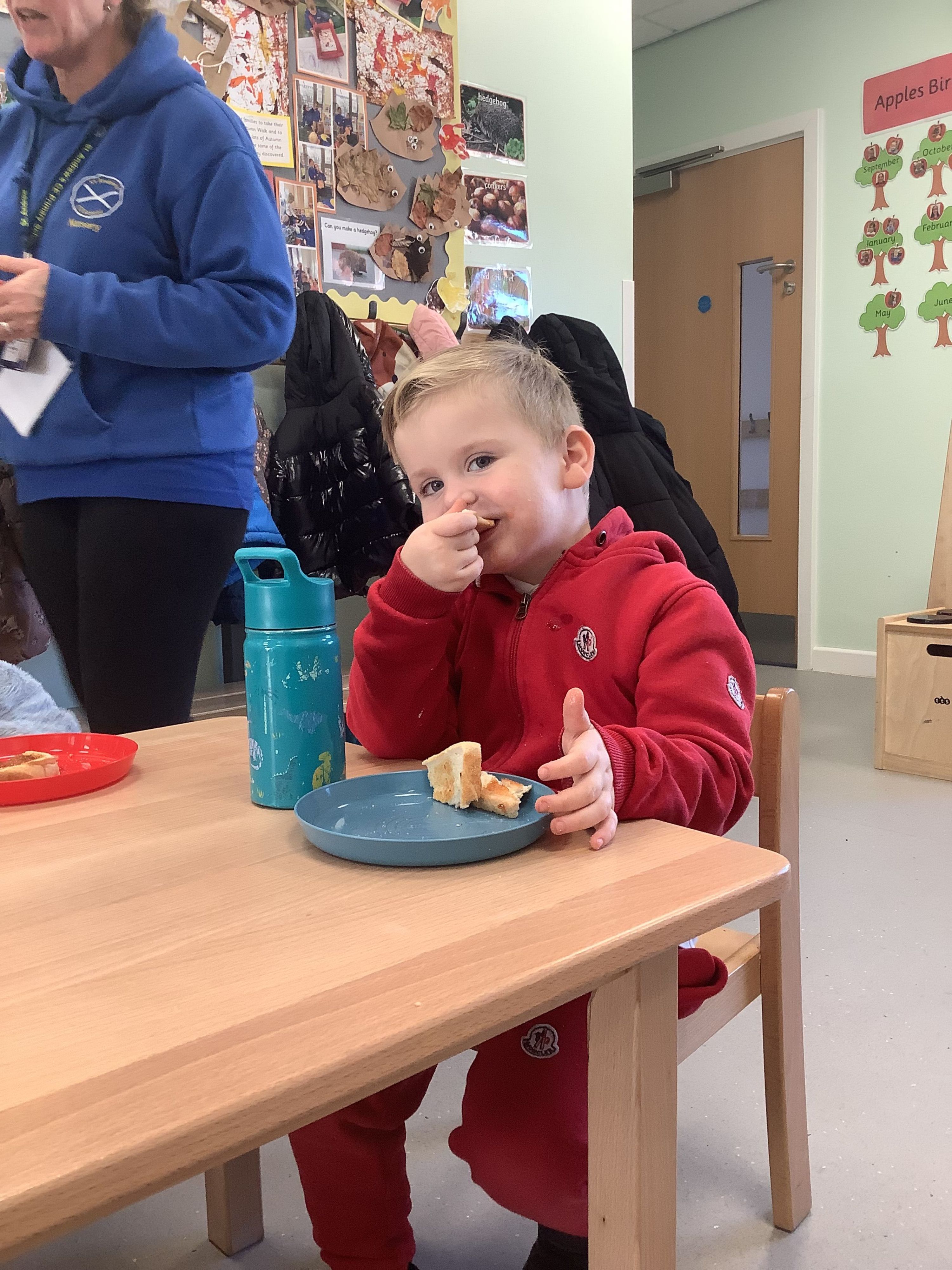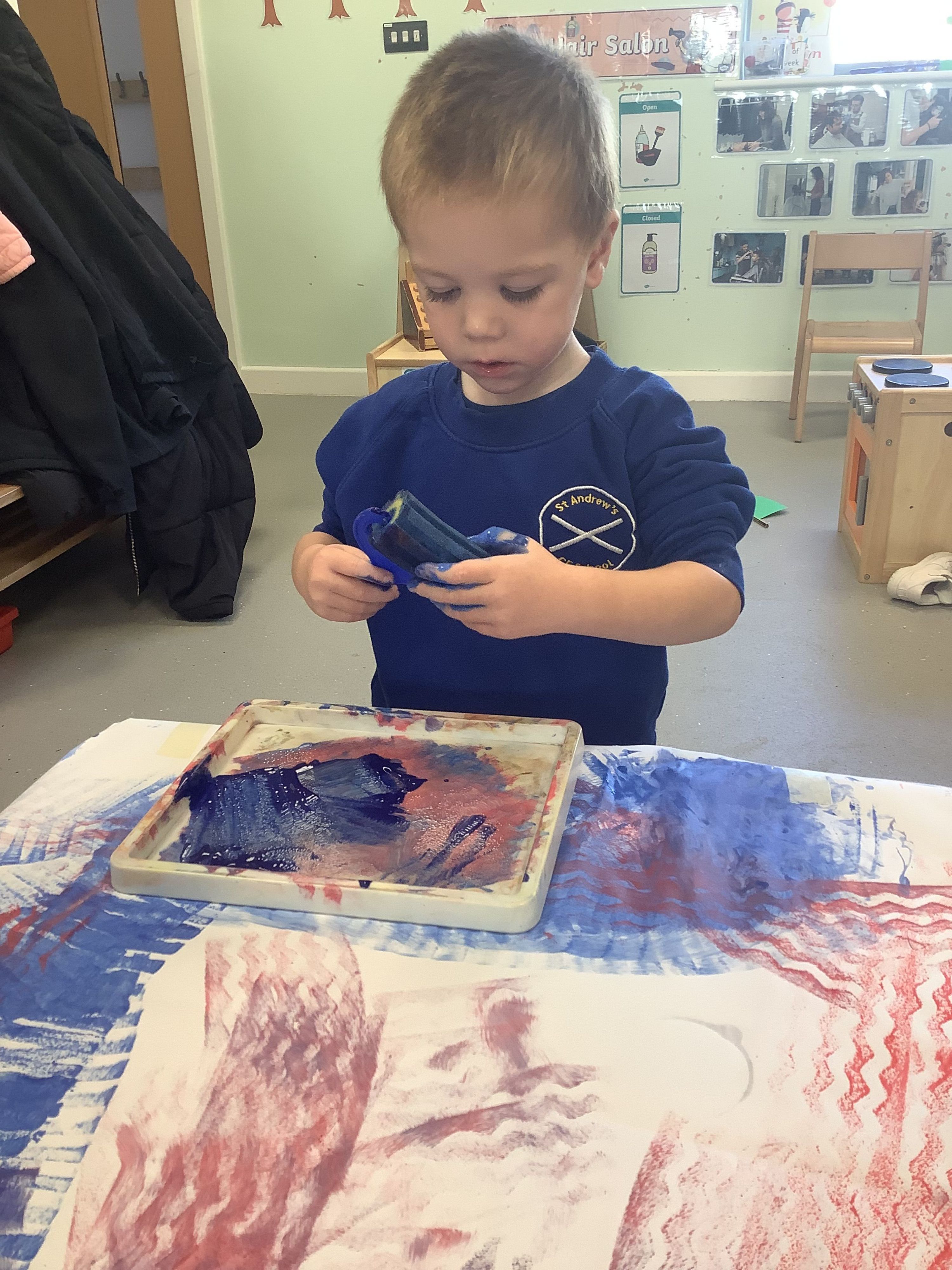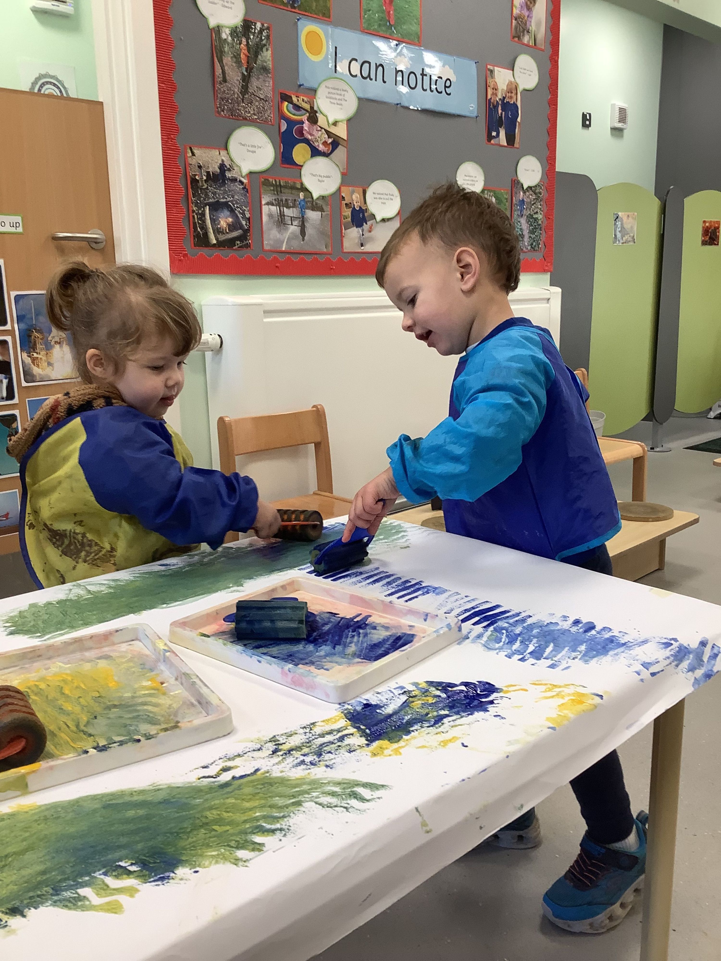Inside the children have had the opportunity to use the paint rollers and mix different colours together whilst rolling the paint up the paper. For snack this week, we have been having toast and crumpets with jam. The children have been very patient waiting for them to pop up from the toaster!